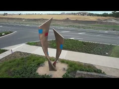 Sweeping arcs and curves represent undulating hills. A conical helix takes form from volcanic vents and water rising. Two twisting planes dance as a willy willy evoking the notion of spirits.