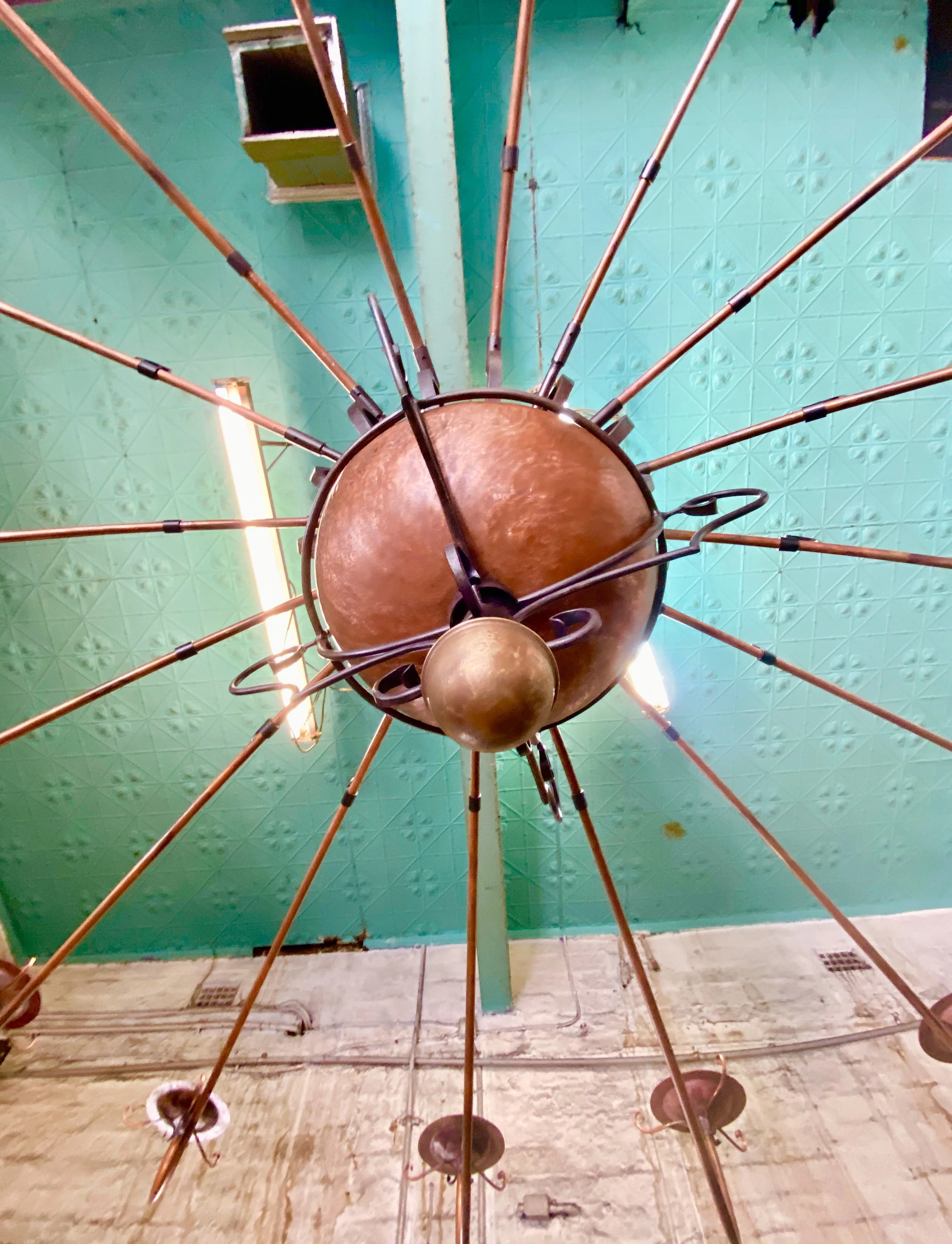 Wrought iron and repoussé copper chandelier with sixteen globes for a country estate.